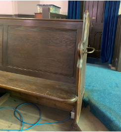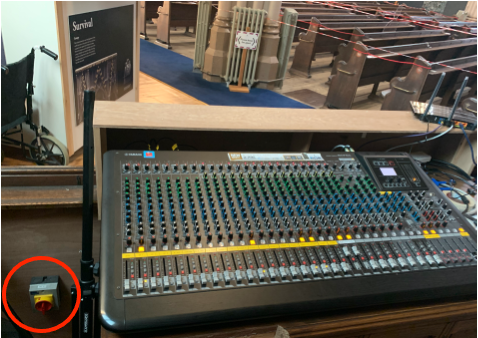 Turn on the sound system using the red switch to the left of the desk. This will turn on the church sound system and the Router